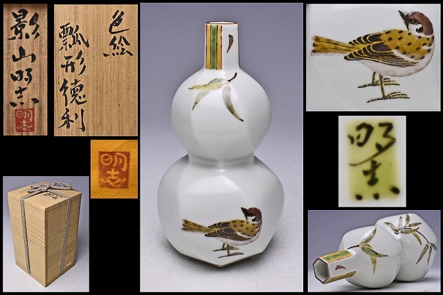 > 影山明志 ★ 色絵 スズメ文 瓢箪 徳利 ★ 共箱 共布 ★ 酒器 ★ 師:人間国宝 藤本能道 ★ 写実が素晴らしく飾っても楽しめる逸品 ★