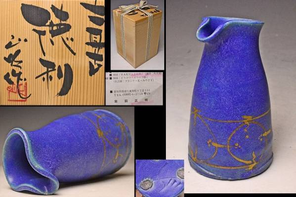 - 柴田正明 ★ 青釉金彩徳利 ★ 共箱栞 ★ 検前衛陶芸オブジェ常滑焼 ★