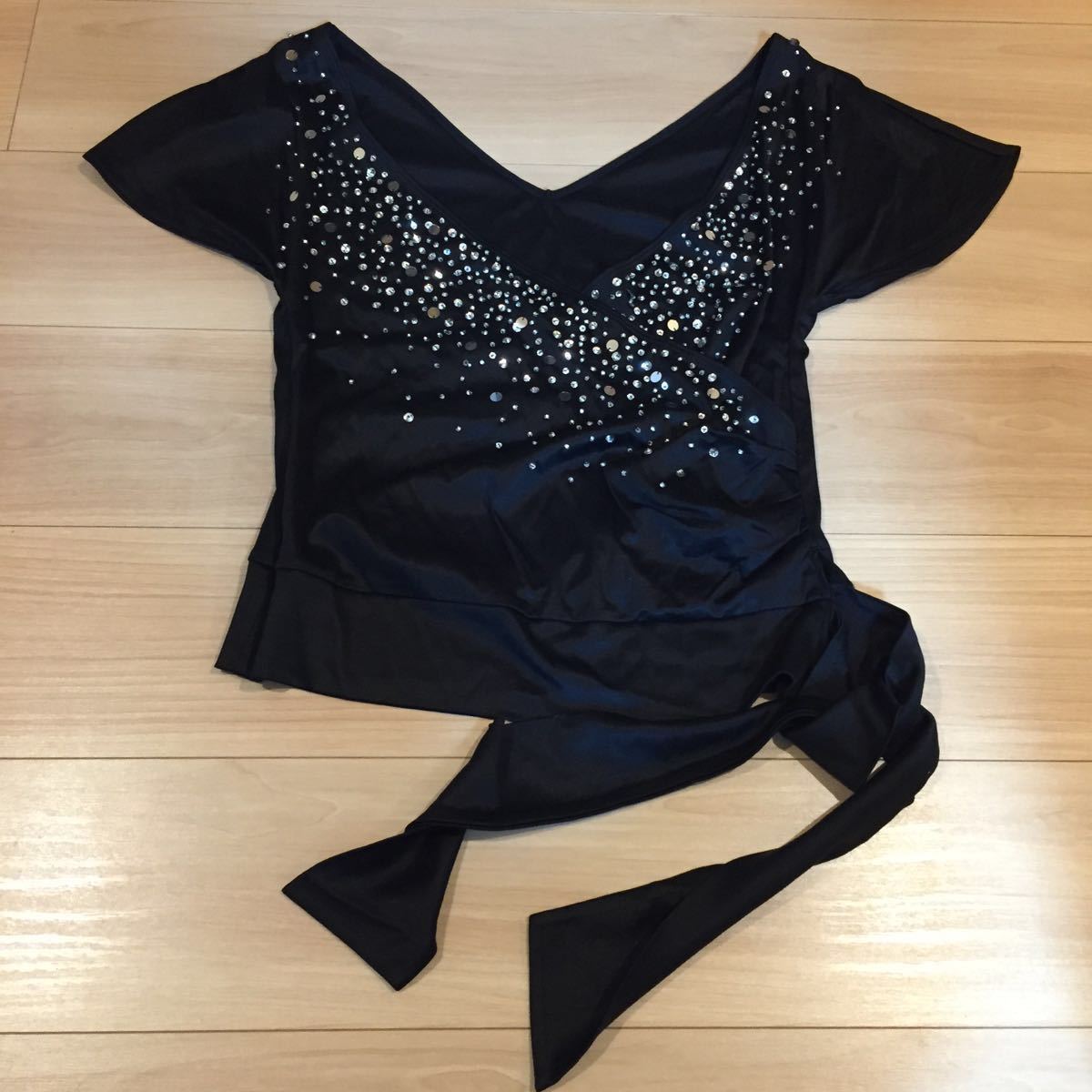> トップス 半袖 前後ともVあき 黒色 ビーズ スパンコール ピンキー&ダイアン Pinky&Dianne 社交ダンス サイズ38 バスト82,身長164 未使用品