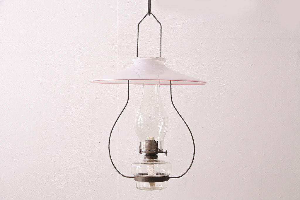 > R-049949 和製アンティーク 平芯5分芯 ピンクの縁が可愛らしいアクセントのオイルランプ(ハンギングランプ、吊り下げランプ、ランタン)