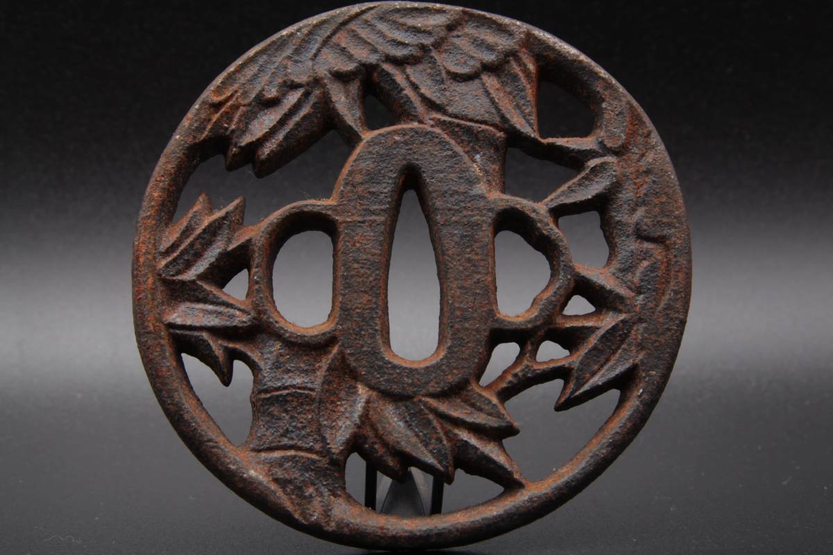 - 鍔 鉄鍔 鉄地 透かし鍔 葉の図 刀装具 日本刀 武具 江戸 侍 骨董 当時物