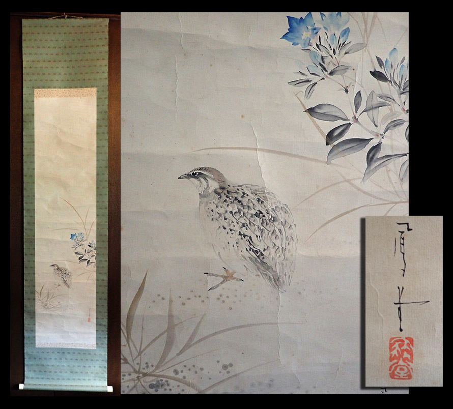 - 【海蛍】掛軸 ○堂 紫陽花に雛鳥 紙本 肉筆 箱無