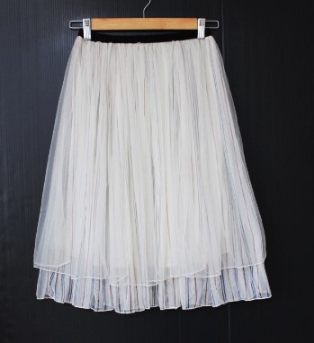 > 美品*CLEF DE SOL*クレドソル*オフホワイト&オフホワイト×グレー×茶:ストライプ柄*レース*ギャザーフレア*チュール*ロング*スカート*M