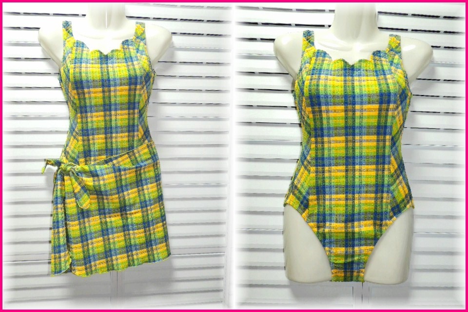 - RIOKA 日本製 ワンピース水着 パレオセット 9号/M イエロー系×グリーン系チェック