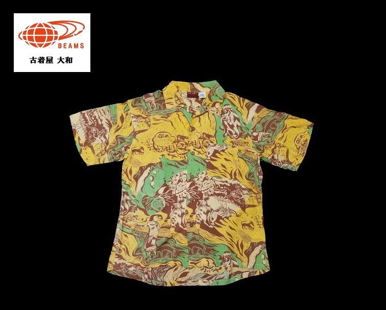 - #古着屋大和 セール中【送料無料】BEAMS ビームス 総柄 アロハ アロハシャツ ハワイアンシャツ Lサイズ イエロー レーヨン100% #古着