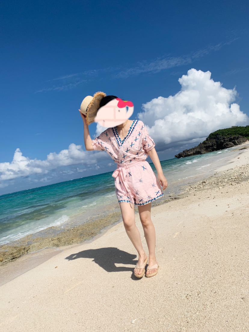 - 花柄 刺繍ピンク麻素材オールインワンS美品