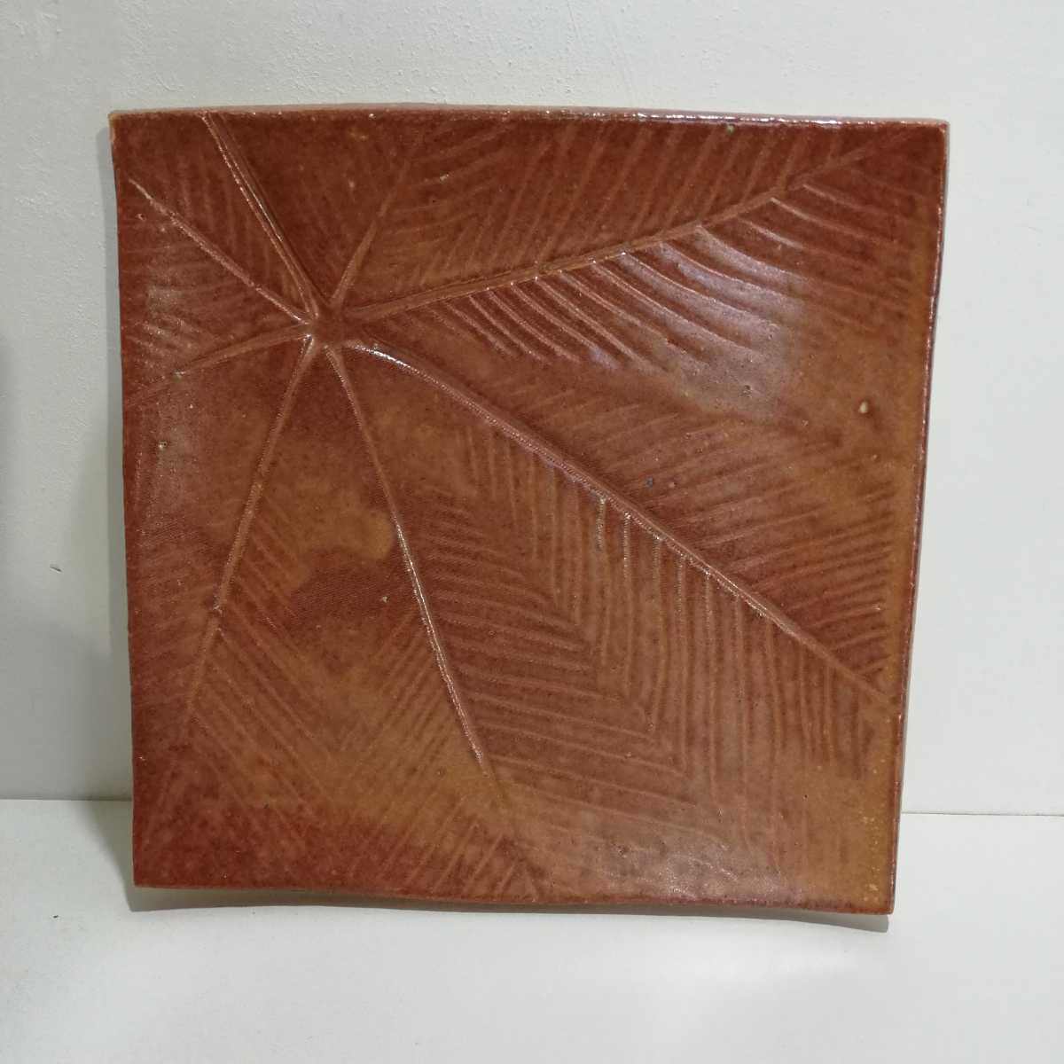 - 在銘 陶器 陰刻葉脈飾り皿 プレート 壁掛け 18.5cm×18.5cm [ 四方皿 和室装飾 枇杷 柏葉]