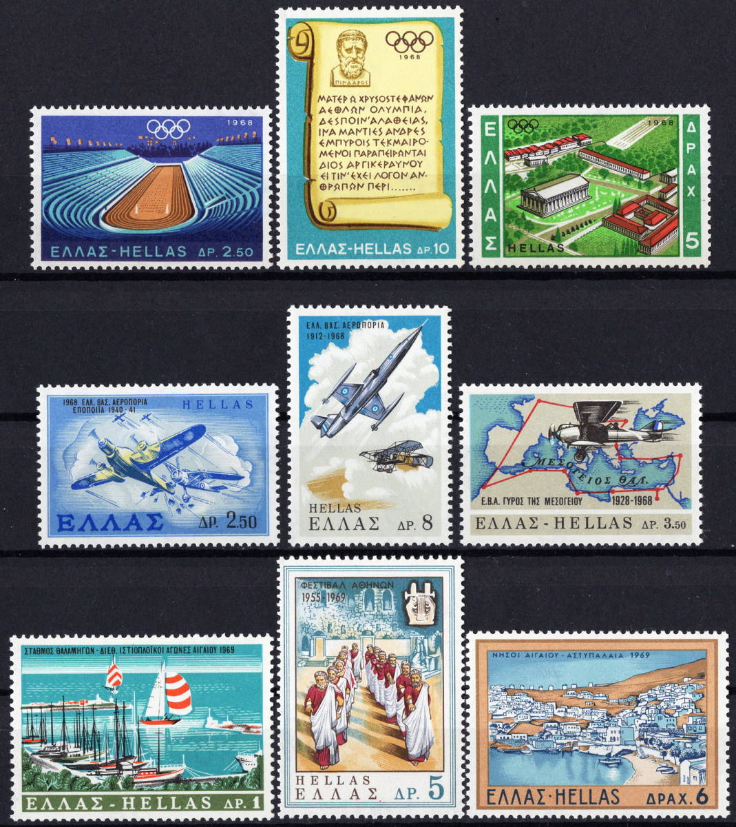 > ★1968-69年 ギリシャ - 「メキシコオリンピック」3種完+「ギリシャ空軍」3種完+「観光宣伝」3種完 未使用(MNH)★VF-65