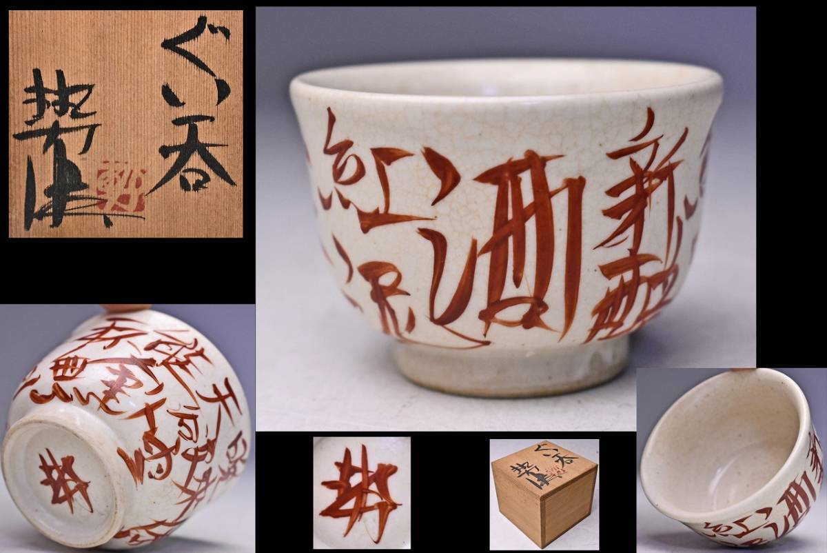 - 村田勢津 ★ 赤絵 ぐい呑 ★ 共箱 ★ 版画家 ★ 文字に味わいのある逸品 ★