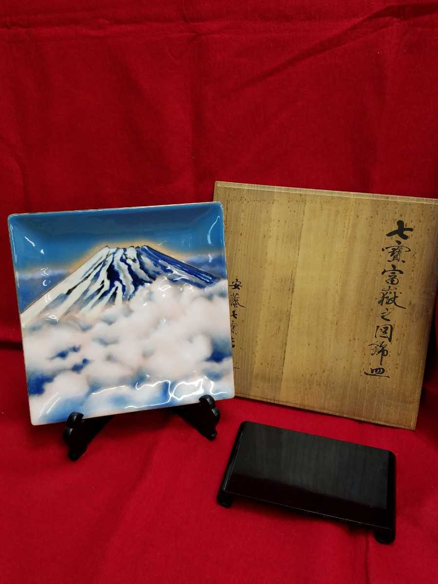 - 未使用 安藤七宝店 富嶽之図飾皿 青富士 幅約25.8㎝ 飾台付 皿たて プレートスタンド付 富士山