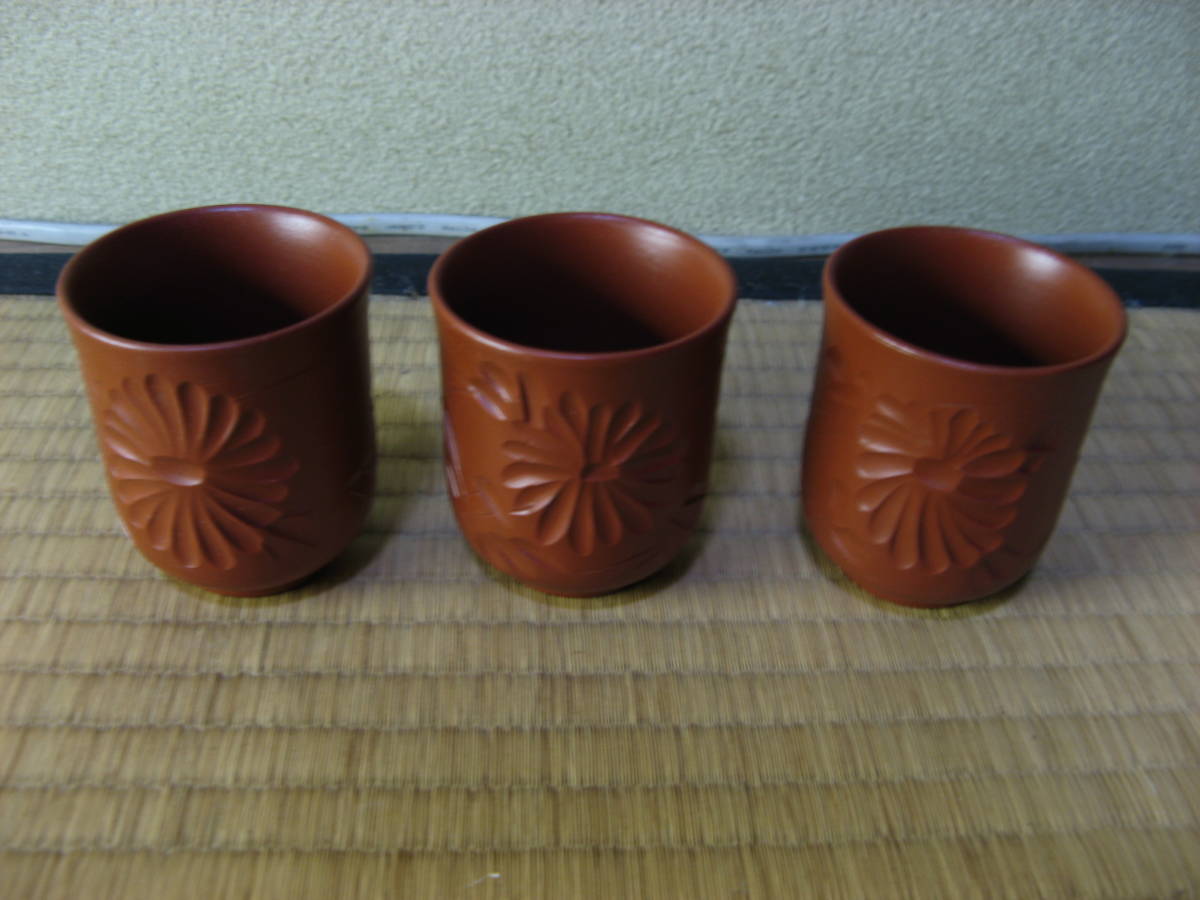 - 湯呑 3客 赤土 茶器 和食器 陶器 昭和 レトロ 同梱手渡し可