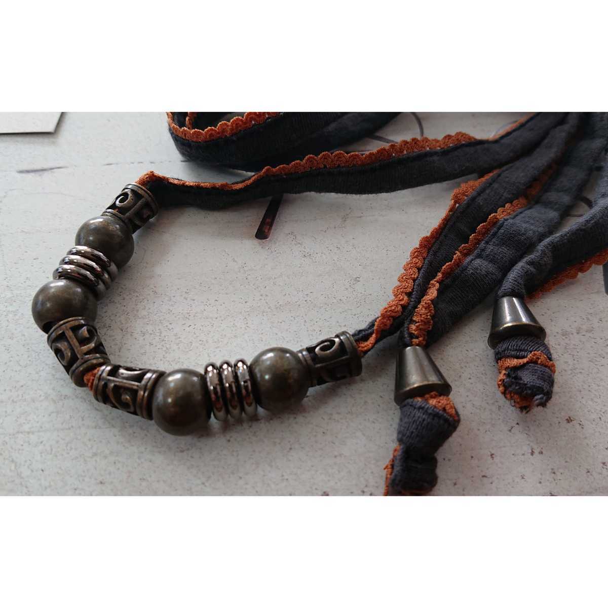 - □アンティーク感&オリエンタルな印象□模様入りビーズ×黒&茶紐のロングネックレス□アレンジ可能□