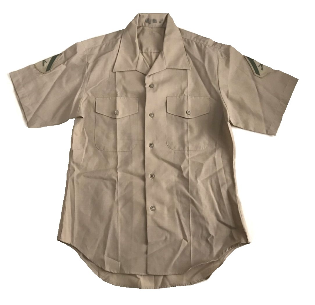 > 【1412】実物 アメリカ製 USMC アメリカ海兵隊 開襟カーキシャツ USサイズ16 階級章パッチ付き