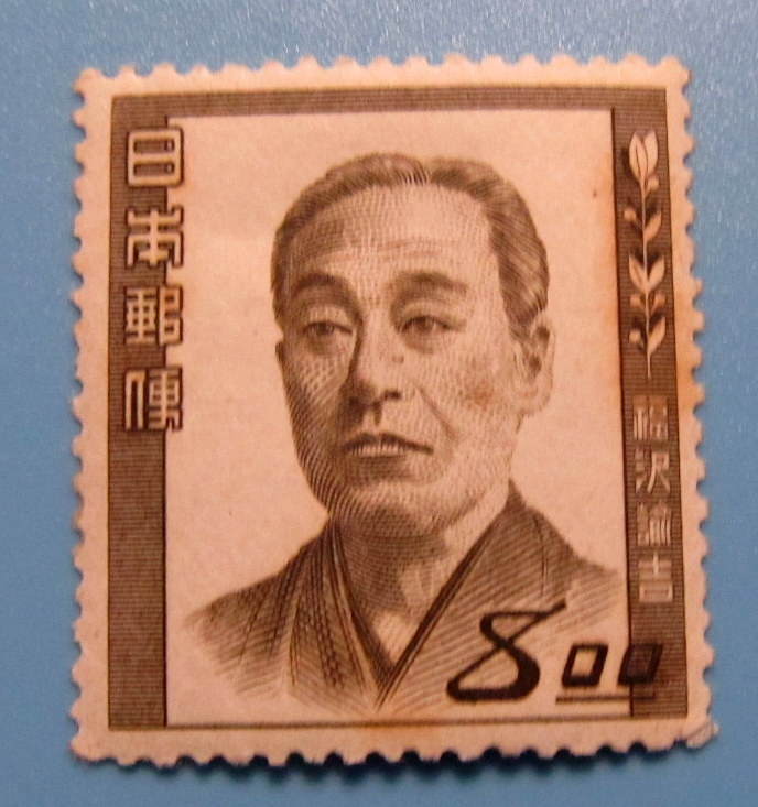 - 文化人切手 8円 福沢諭吉 ヒンジ跡 裏のりきれい 少し丸まり 未使用