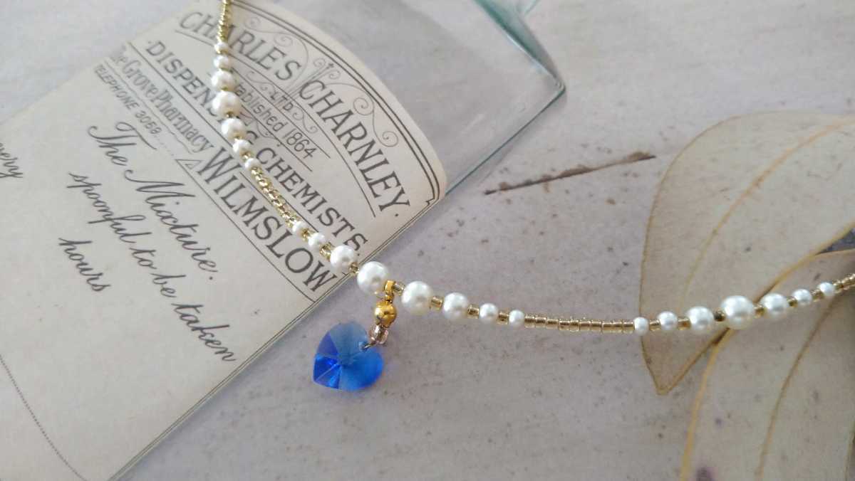 - □訳あり□クリアブルー・ハートビジュー&ゴールドカラー・パールビーズ・チョーカー□