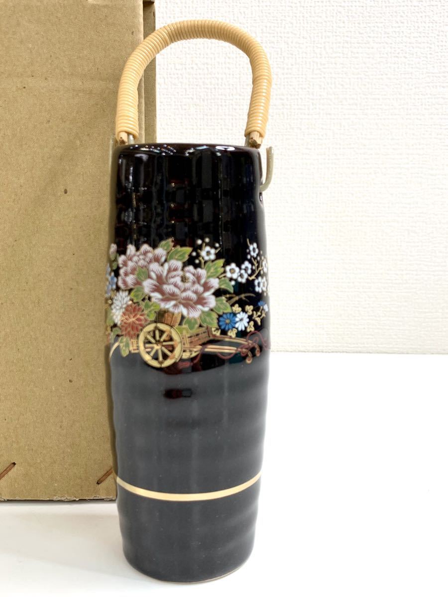 - 未使用品▼九谷焼 花瓶 一輪差し 取手付き 金彩花籠 陶器 花器 箱付き 管理2106 J-12