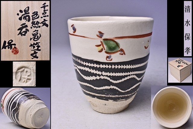 > 清水保孝 ★ 千点文色絵亀遊文湯呑 ★ 共箱栞 ★ 白黒と赤絵のコントラスト ★ 人間国宝 清水卯一 師事 ★ 京焼 清水焼 ★