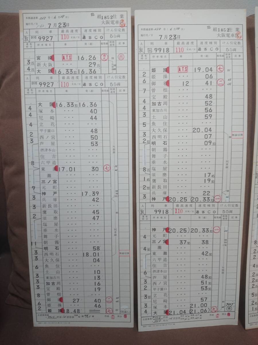- 動力車乗務員運転時刻表 スタフ 大阪電車区 昭和63年7月23日 臨組1852仕業 回9927列車~ 行路揃い4枚組 14系4両 宮原操-姫路
