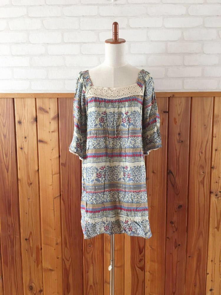 - 訳あり B品 未使用 Mignon レディース チュニック ワンピース Lサイズ エスニック アジアン雑貨 ヒッピー 花柄 半袖~5分袖 W