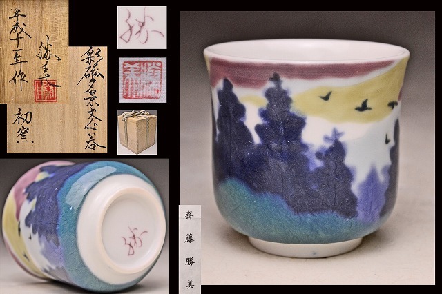 - 斎藤勝美 ★ 彩磁 夕景文 ぐい呑 ★ 共箱 ★ 釉下彩が美しい逸品 ★ 酒器 ★