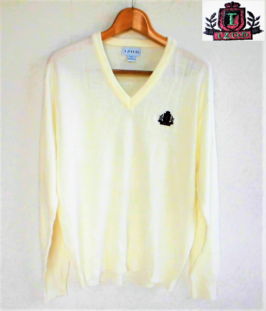 > 【即決】IZODアイゾッド 豪華刺繍ロゴ入りニットセーター★薄手Vネック アクリル/メンズXLアイボリー/日本未発売 ホームクリーニング済み