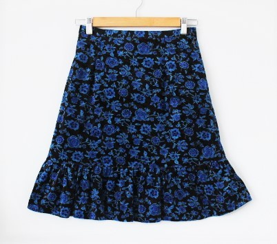 > 美品*peignot bee*ペグトビー*黒×青*花柄*ベロア素材*すそフリル*フレア*ひざ丈*スカート*ウエスト67*ヒップ93*L*レディース