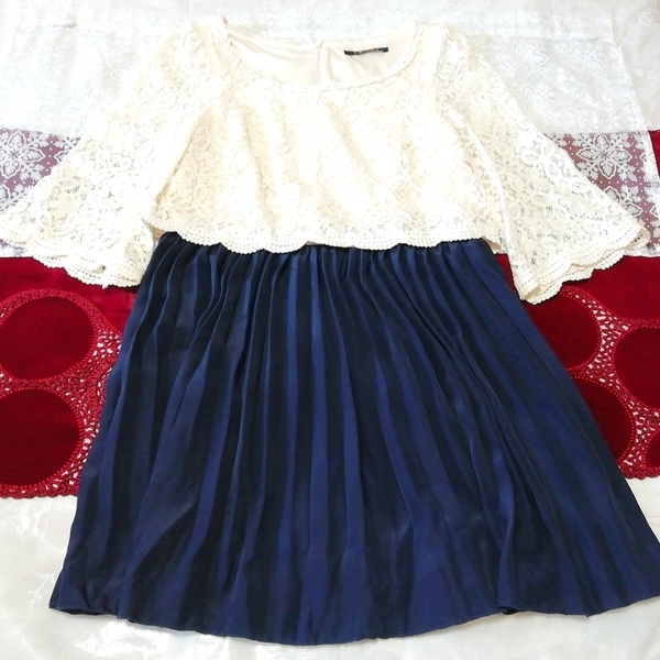 > 白レース紺シフォンプリーツスカート長袖チュニック ネグリジェ ワンピース White lace navy chiffon pleated skirt tunic negligee dress