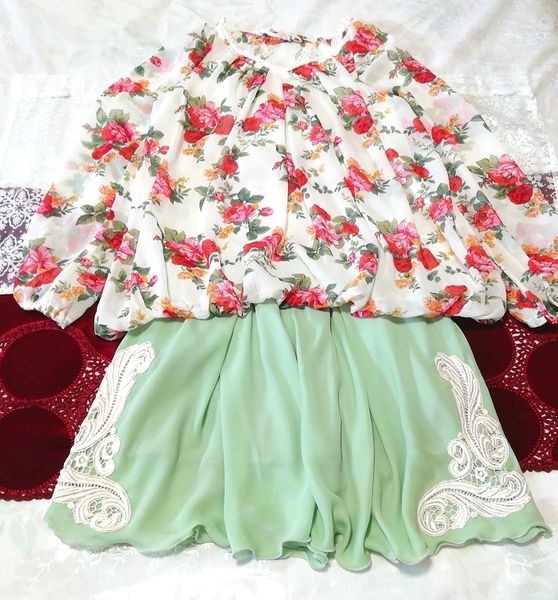 > 白赤花柄シフォンチュニック ネグリジェ ナイトウェア 緑ショートパンツ 2P White red floral chiffon tunic negligee green shorts
