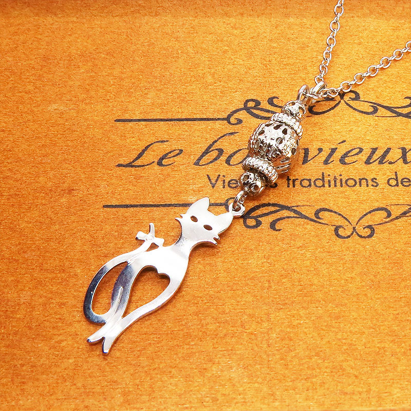 - シルバーカラー スマートな猫シルエットモチーフと透かしメタルビーズのネックレス 長さ調整可 アジャスター可