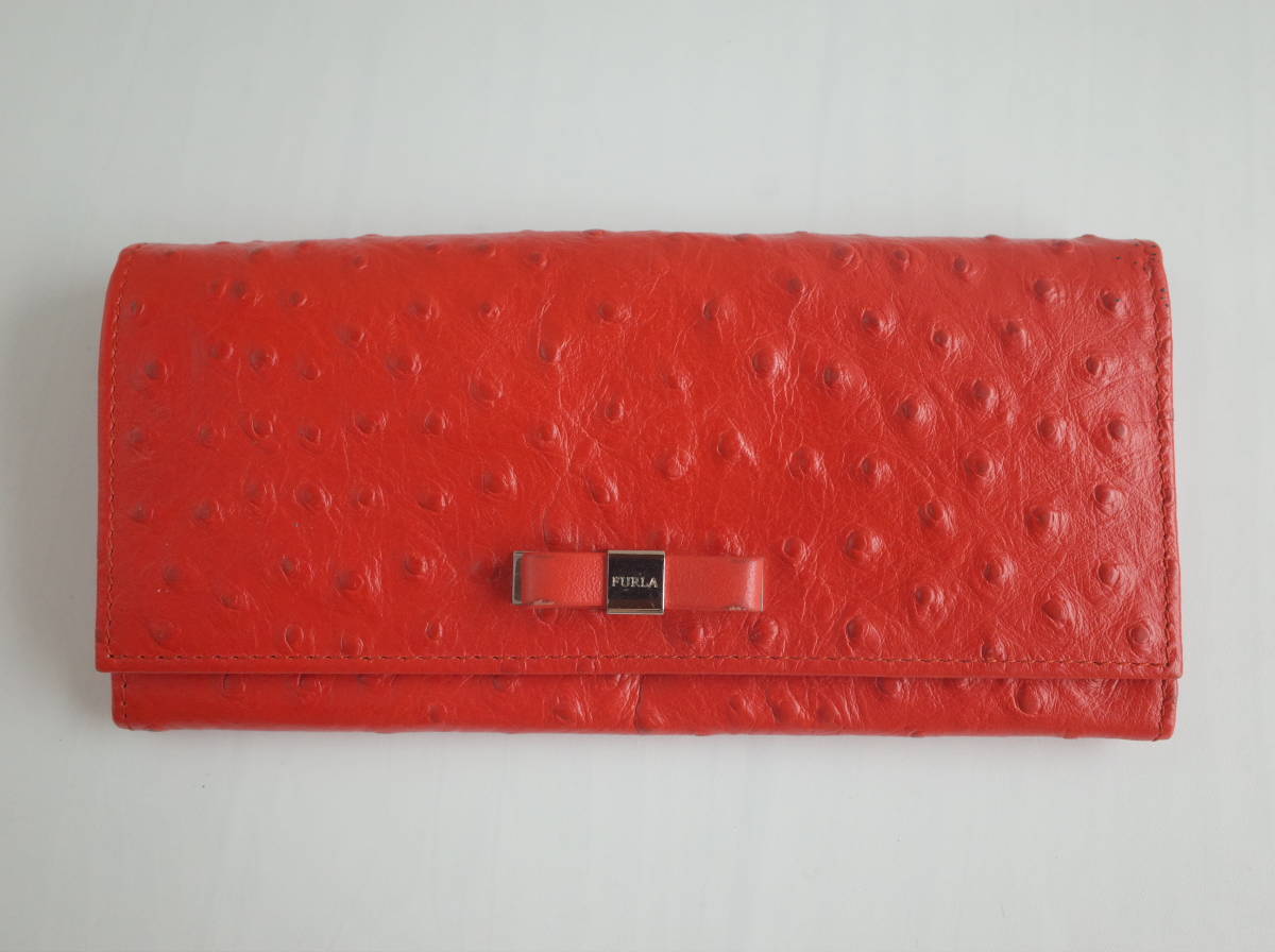 - refle【鑑定済み】長財布 フルラ FURLA オーストリッチ 型押し リボン オレンジ? レッド? 赤? 財布 ウォレット[①]