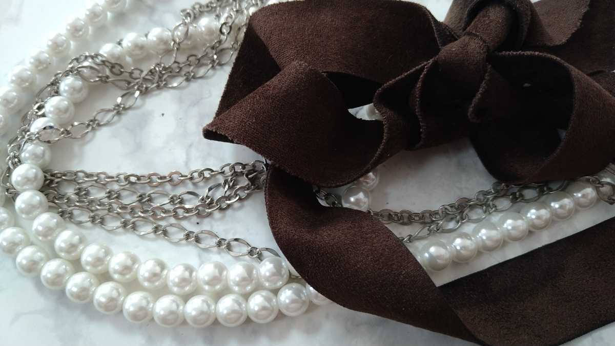 - □焦げ茶リボン×パールビーズ×シルバーカラーチェーン・ネックレス□