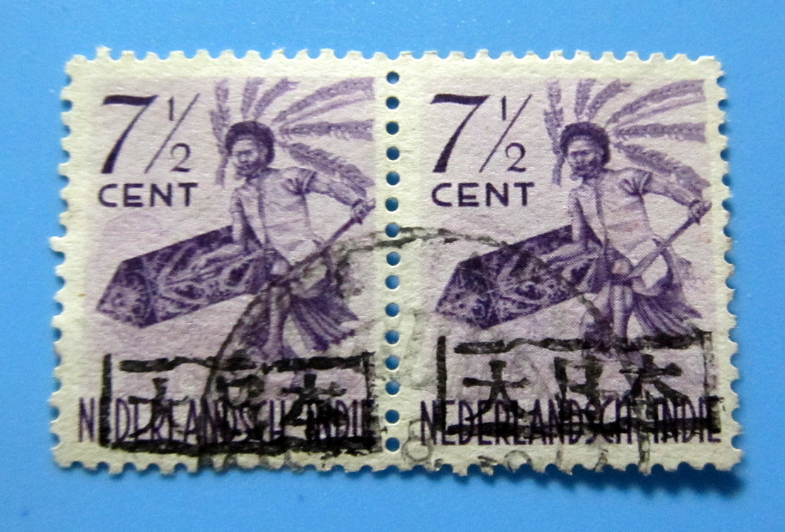 - 南方占領地 切手★オランダ領東インド スマトラ 7 1/2 ペアー 大日本 加刷 丸まり ヒンジ跡 使用済み