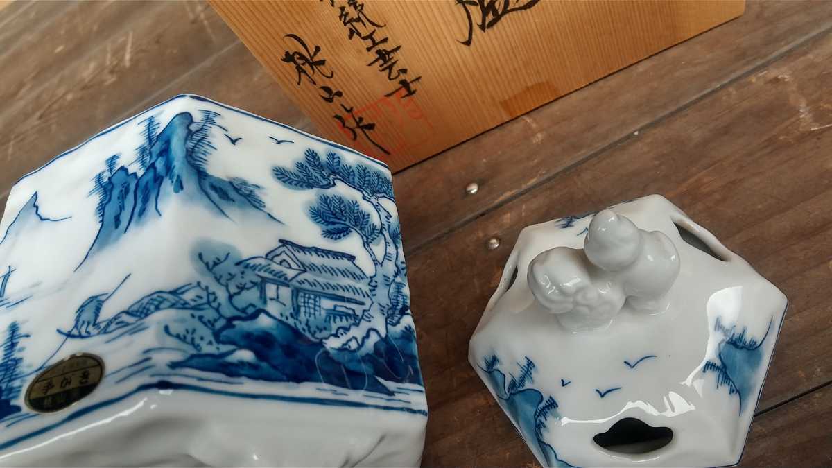 - 鍋島焼 青木桃山窯 伝統工芸士 青木桃山 作 獅子に古家山水染付 六角香炉 共箱