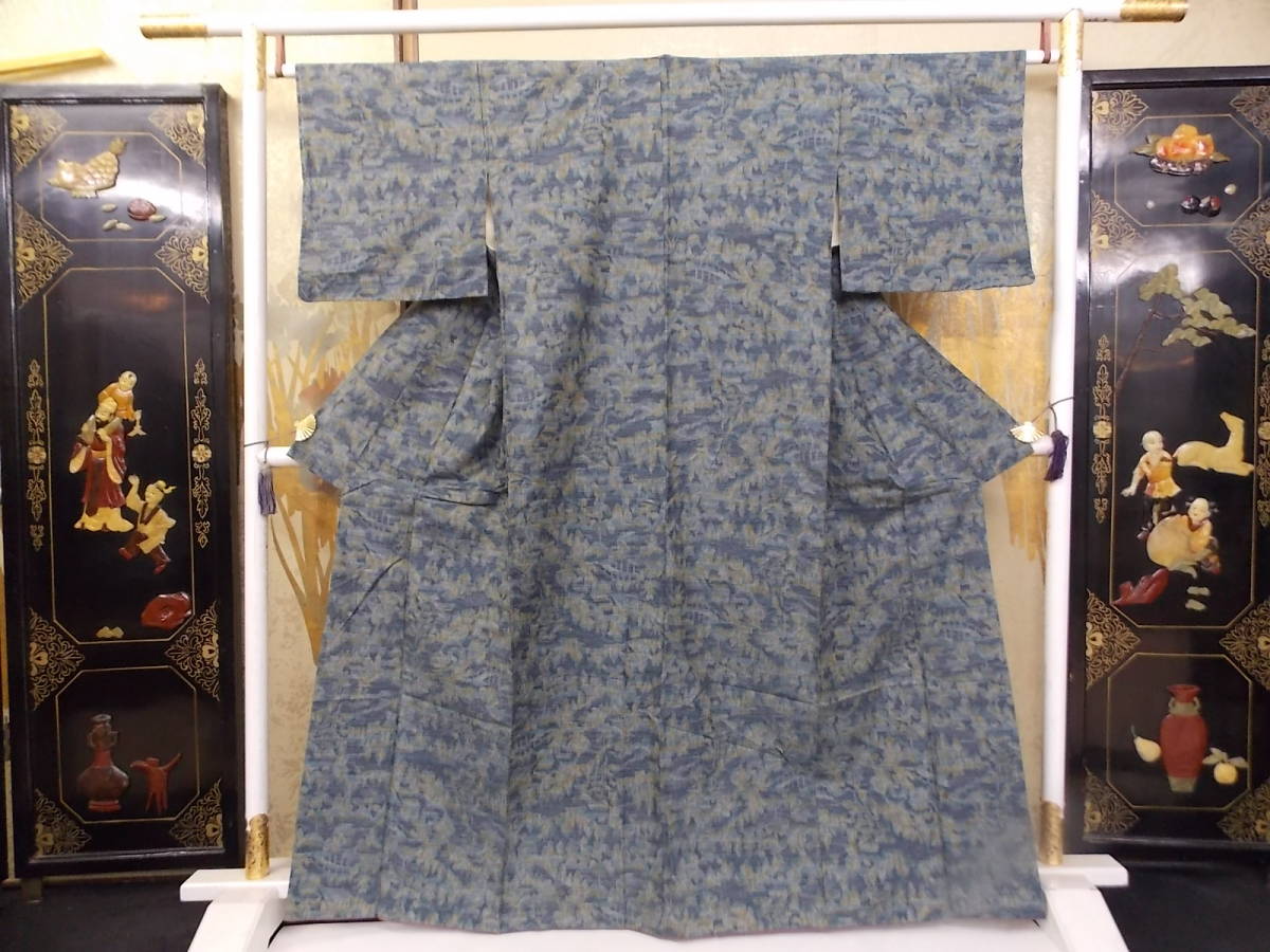 > きもの今昔3255 絣紬袷きもの 青味を帯びた絣柄で 樹木に母屋に橋脚の風景柄