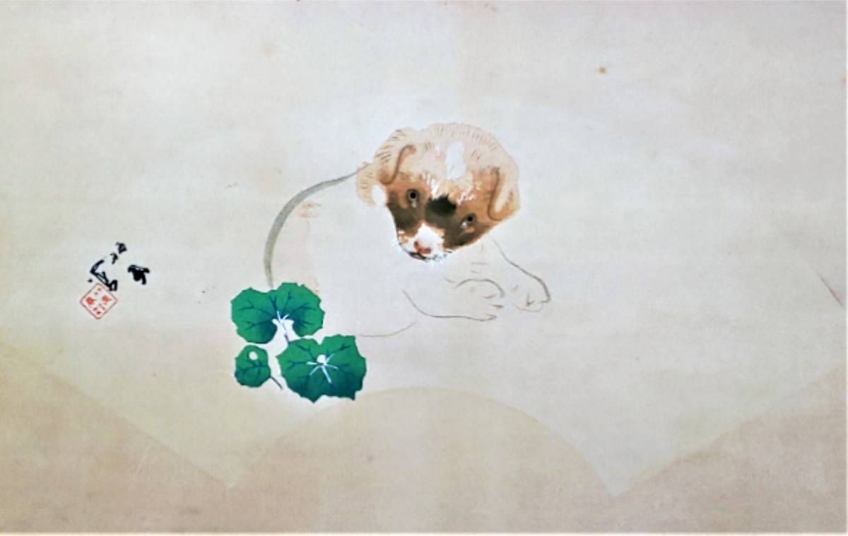- 竹内栖鳳 横山大観と双璧 真作版画「子犬」大正15年岸版画印刷所製「名家扇面画譜」より