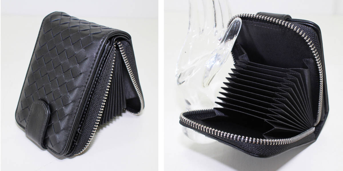 - 最後の1点 イントレチャート 編み込み ラムスキン 子羊皮革 ZIP ジャバラ カードケース(大きいサイズのカードも収納可)