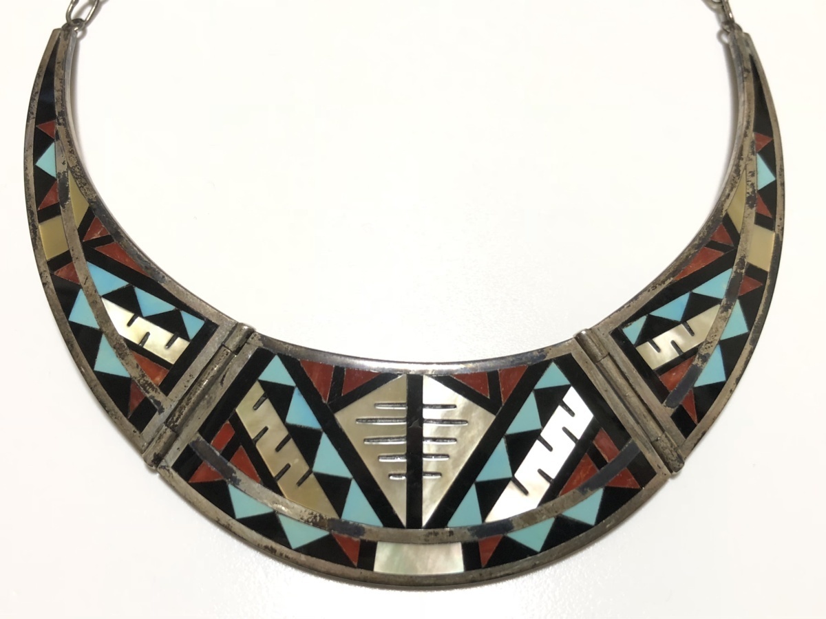 > インディアンジュエリー ズニ族 ターコイズ レッドコーラル シェル SILVER 32.5g 作家物 Alex&Marylita Bome インレイ ネックレス