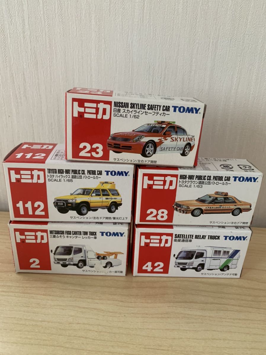 > トミカ 絶版 5台セット ③ 衛星通信車 ハイラックス クラウン 道路公団 スカイラインセーフティーカー キャンターレッカー車(本体変色)