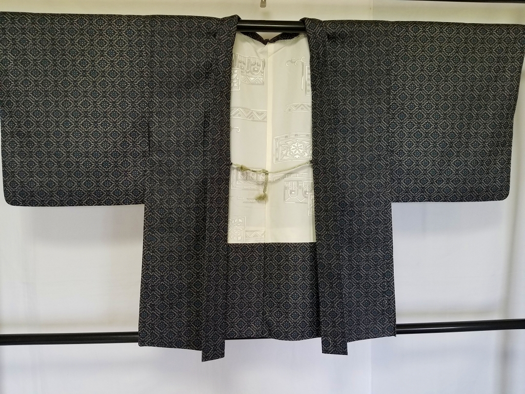 > 【桐徳】御召地.羽織☆10%値下げ*着用感なし{正絹*御召地*袷仕立*羽織}*丈76-裄63*黒地に白と青色糸の絣織の花菱*羽織り紐付き*№5461
