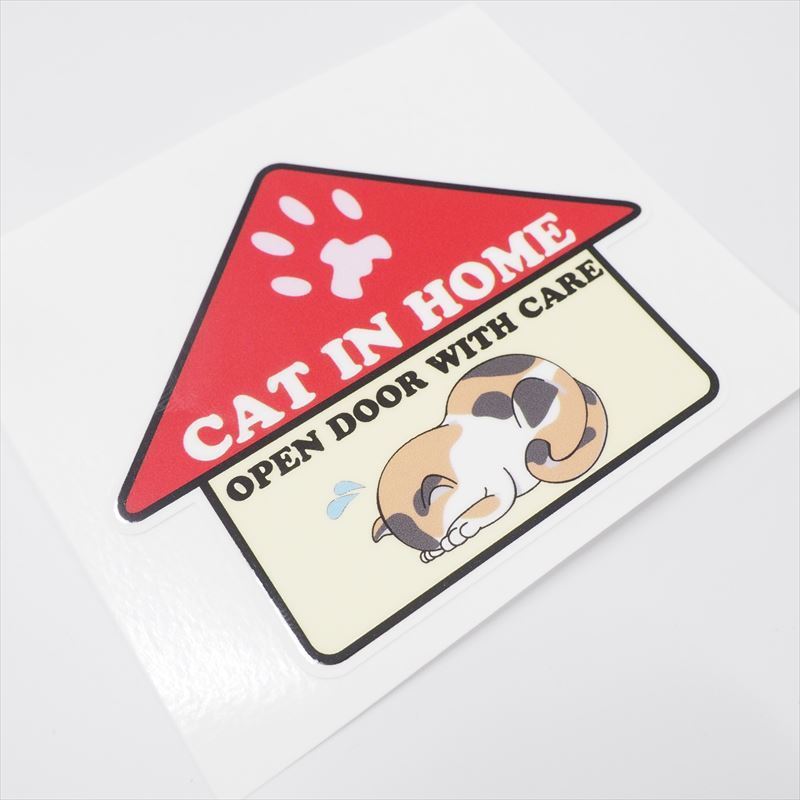 - 家型 ネコがいます 三毛ネコ 飛び出し注意ステッカー 猫 玄関 ドア ネコグッズ ねこ cat in home 注意シール 三毛猫