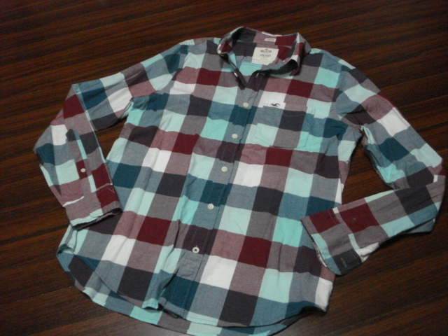 > ホリスターチェック柄長袖シャツ/水色赤/メンズ/L