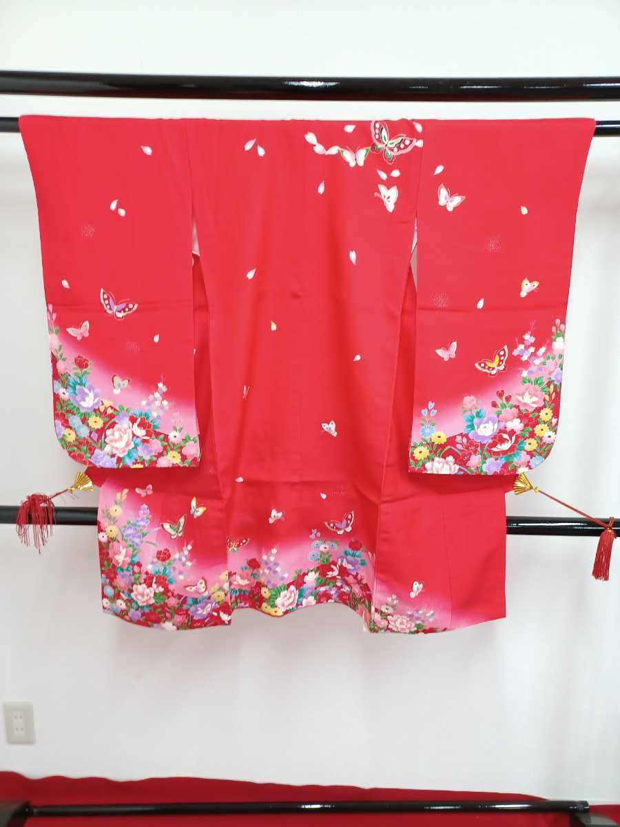 - 【岩・七女⑭】七五三 3歳 着物 長襦袢 2点セット 女児 式典 花 蝶々 赤 刺繍 華やか 上品 可愛い おしゃれ 220601