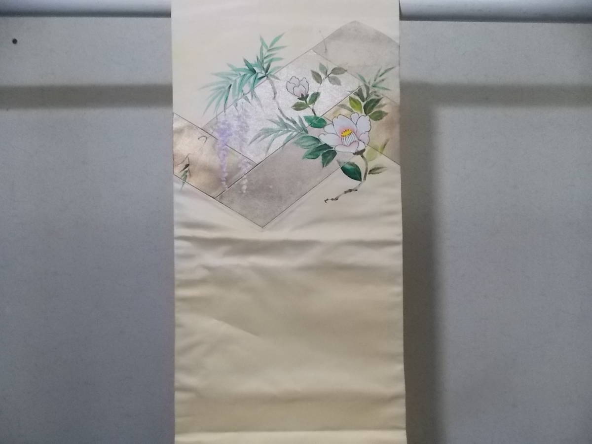 > きもの今昔3846 名古屋帯 西陣織九寸 正絹錦織クリーム地色パッチワーク(引き箔織生地入れ込み)に手描き椿と藤