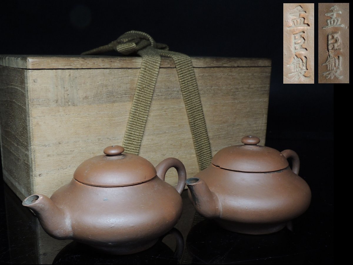 > ◆中国古玩・朱泥・孟臣製・急須・2客・一対・茶壷・茶心壷・在印・唐物・箱付◆a796