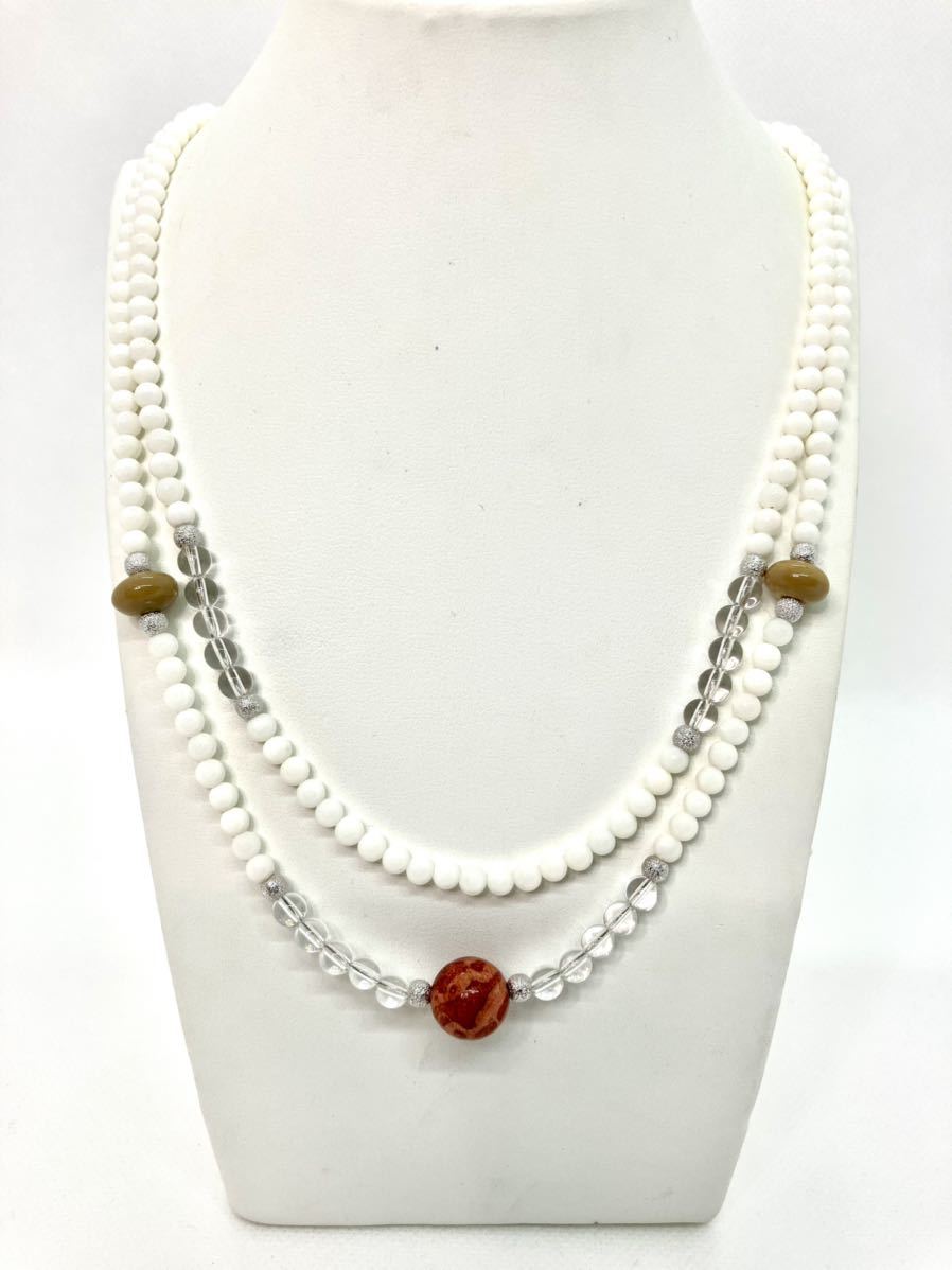 > 【新品】アフリカ珊瑚/白珊瑚二連デザインネックレス*コーラルcoral*水晶*天然ネックレス*三月の誕生石*天然石*一点物