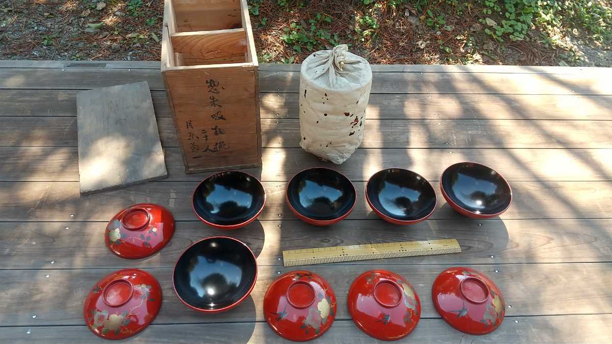 - 内黒外朱塗吸物椀10客 椿に鳥蒔絵 木箱 推定年代大正~昭和初期