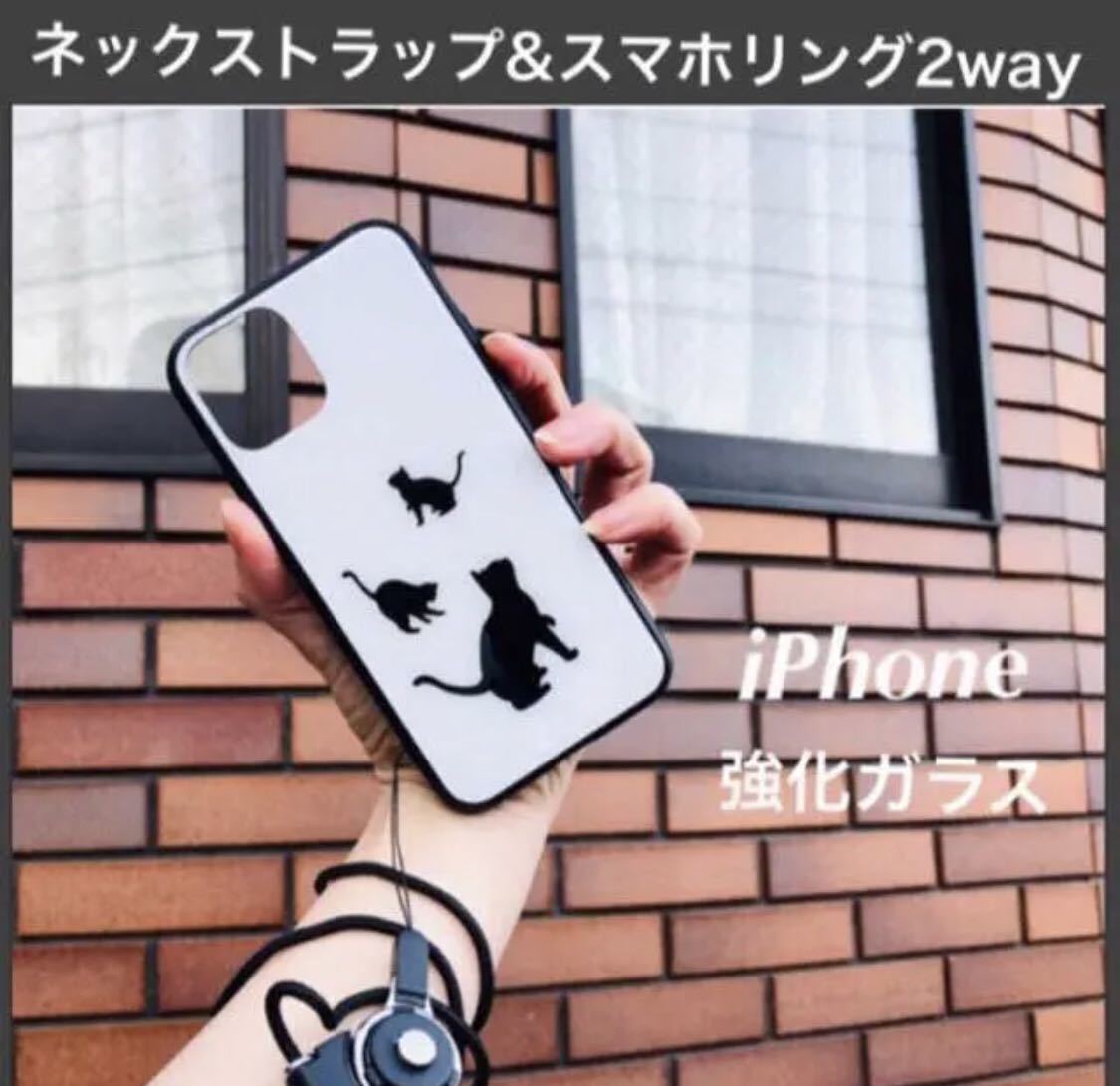 - ネックストラップ&スマホリング2way iPhoneケース 猫の親子 iPhone11proケース 強化ガラスケース ねこ クロネコ 黒猫 iPhoneカバー