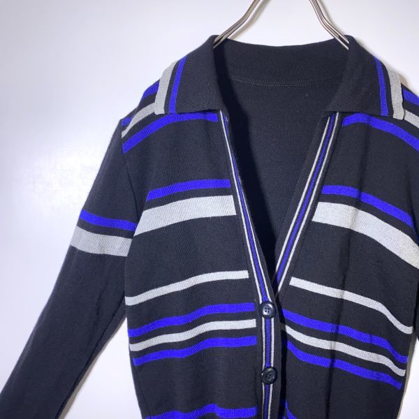 - 80s 90s 古着 レディース 長袖 ニット カーディガン ウール 青ボーダー