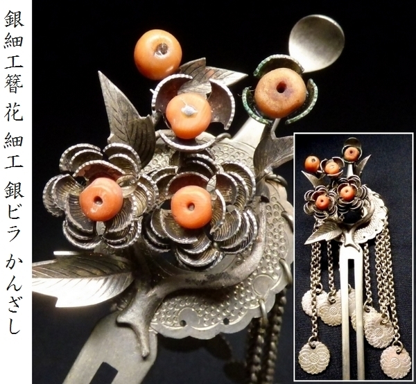 【 恵 #0073 】 銀細工簪 花 細工 銀ビラ かんざし 簪 珊瑚 時代簪