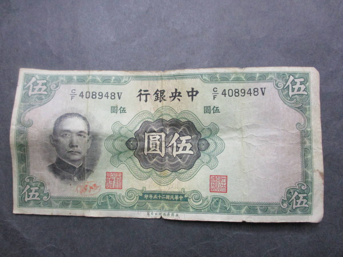 - ★中国紙幣 中央銀行 伍圓 中華民国25年印 1枚★